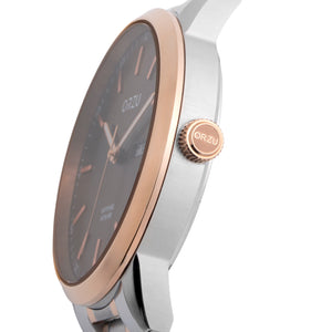 Elegant and distinctive, this ORZU men’s watch features a rich brown round dial complemented by a silver and rose gold stainless steel bracelet. Crafted with premium materials for enduring comfort and superior quality, it blends timeless style with modern refinement—ideal for both everyday wear and formal occasions.