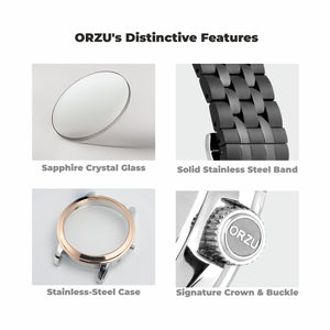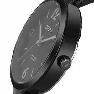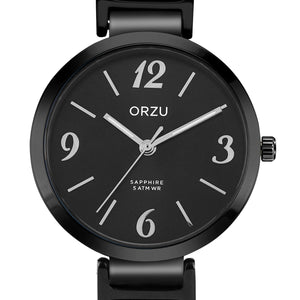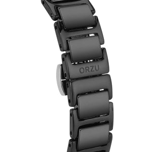 Bold and refined, this ORZU women’s watch showcases a sleek black round dial paired with a striking black stainless steel and ceramic bracelet. Designed for lasting comfort and elevated style, it blends premium craftsmanship with modern elegance—perfect for enhancing both everyday looks and evening ensembles.