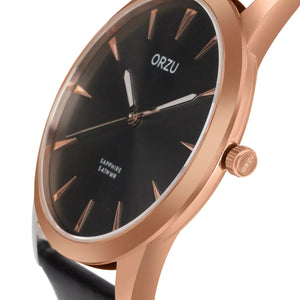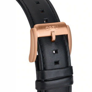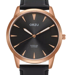 Refined and versatile, this ORZU men’s watch features a sleek black round dial paired with a smooth black leather strap. Crafted with premium materials for lasting comfort and exceptional quality, it blends timeless elegance with modern appeal—making it a sophisticated choice for any occasion.