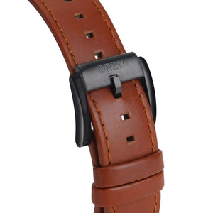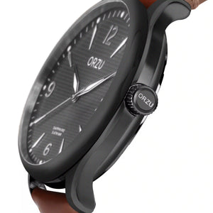 Sophisticated and versatile, this ORZU men’s watch features a bold black round dial paired with a rich brown leather strap. Designed for lasting comfort and crafted with premium materials, it offers exceptional quality and timeless style—perfect for elevating everyday looks or complementing formal attire.
