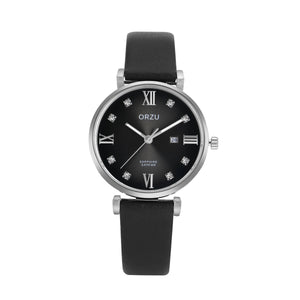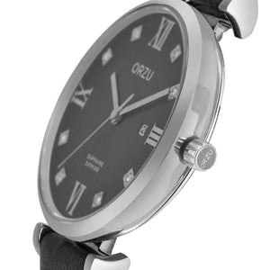 Refined and versatile, this ORZU women’s watch features a sleek black round dial paired with a supple black leather strap. Designed for lasting comfort and understated elegance, it offers premium quality and timeless appeal. A perfect blend of style and durability for the modern woman’s everyday ensemble.