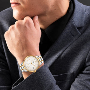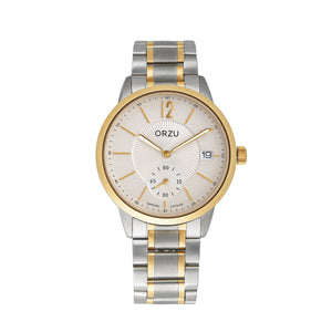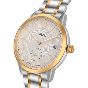 Embrace timeless elegance with the ORZU men's watch, featuring a refined gold and silver stainless steel bracelet paired with a crisp white round dial. Designed for lasting comfort and impeccable style, this sophisticated timepiece reflects ORZU’s dedication to premium quality and modern craftsmanship—perfect for the discerning gentleman.