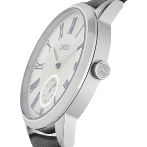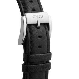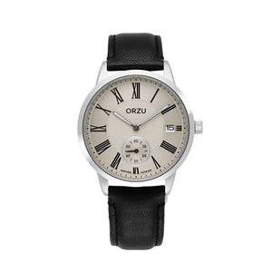 Elevate your everyday look with the ORZU men's watch, featuring a sleek black leather strap and a crisp white round dial. Designed for lasting comfort and timeless appeal, this refined timepiece showcases ORZU’s dedication to superior craftsmanship, blending modern style with enduring quality for the discerning gentleman.