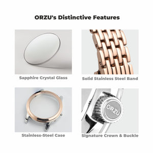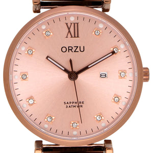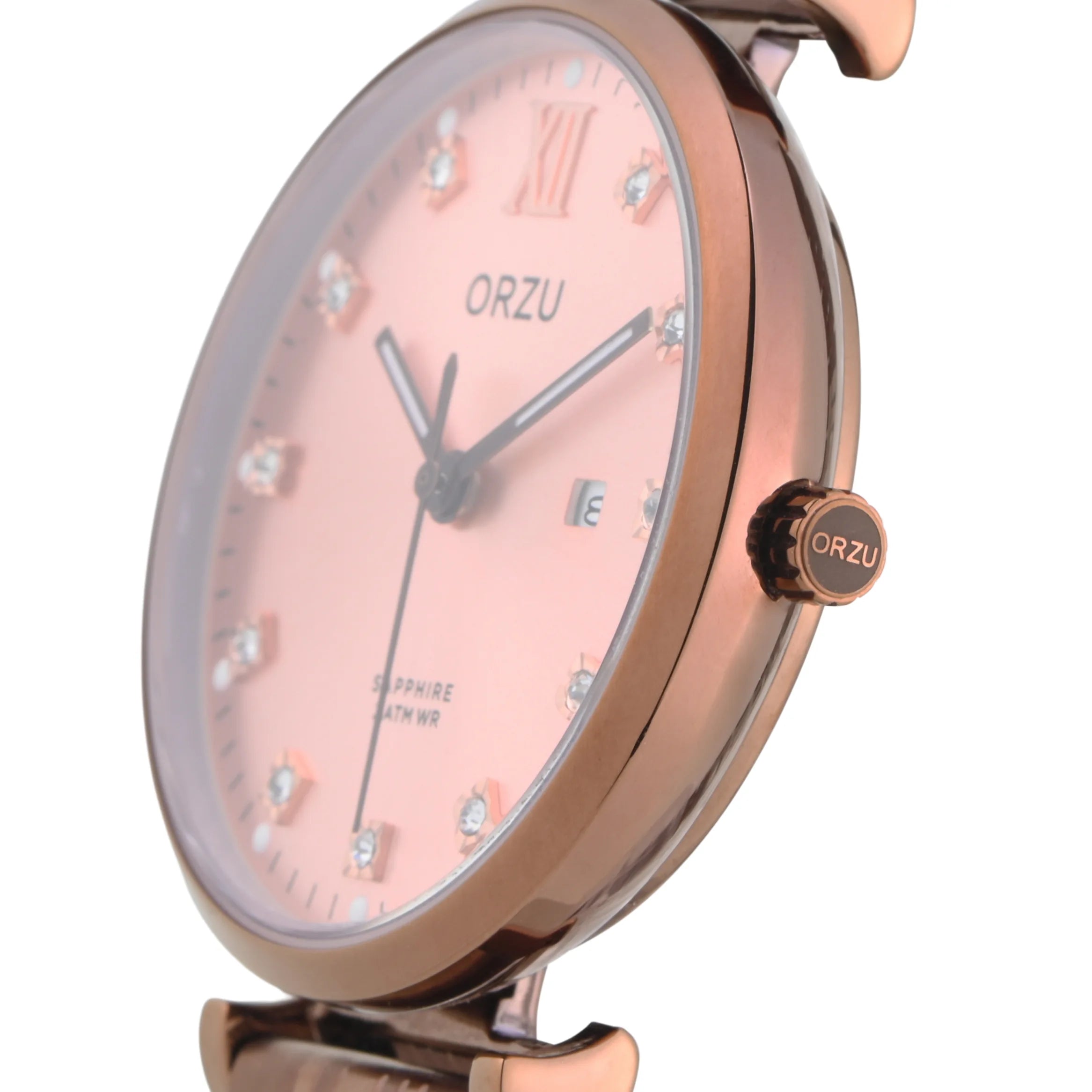 Add a touch of refined glamour with ORZUâs womenâs watch, featuring a radiant rose gold round dial and a rich rose gold stainless steel strap. Designed for lasting comfort and timeless style, this elegant timepiece blends durability with sophisticationâperfect for elevating both everyday looks and evening ensembles.