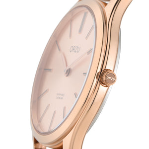 Gracefully designed for the modern woman, this ORZU watch features a soft light pink round dial paired with a radiant rose gold bracelet. Crafted with precision and premium materials, it offers lasting comfort, refined elegance, and timeless style—perfect for enhancing both everyday looks and special occasions.
