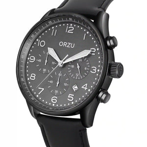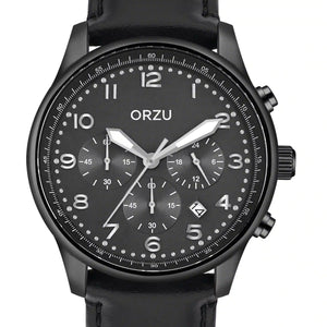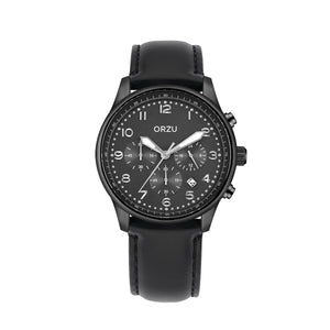 Elegant and bold, this ORZU men’s watch pairs a deep black round dial with a refined black leather strap. Crafted for superior comfort and enduring quality, it embodies timeless sophistication and modern appeal—an ideal accessory to elevate both everyday style and formal attire.
