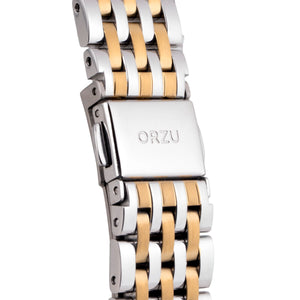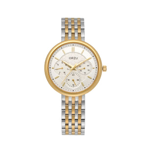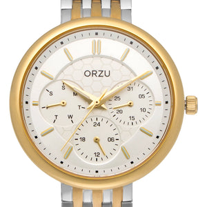 Refined and radiant, the ORZU women's watch features a silver and gold stainless steel bracelet paired with a polished silver round dial. Designed for lasting comfort and timeless elegance, this sophisticated timepiece reflects ORZU’s commitment to premium quality—ideal for the woman who values graceful design and modern luxury.