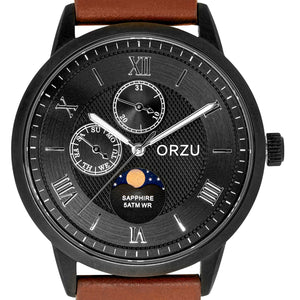 Sophisticated and versatile, this ORZU men’s watch features a bold black round dial paired with a rich brown leather strap. Designed for lasting comfort and crafted with premium materials, it offers exceptional quality and timeless style—perfect for elevating both everyday looks and formal attire.
