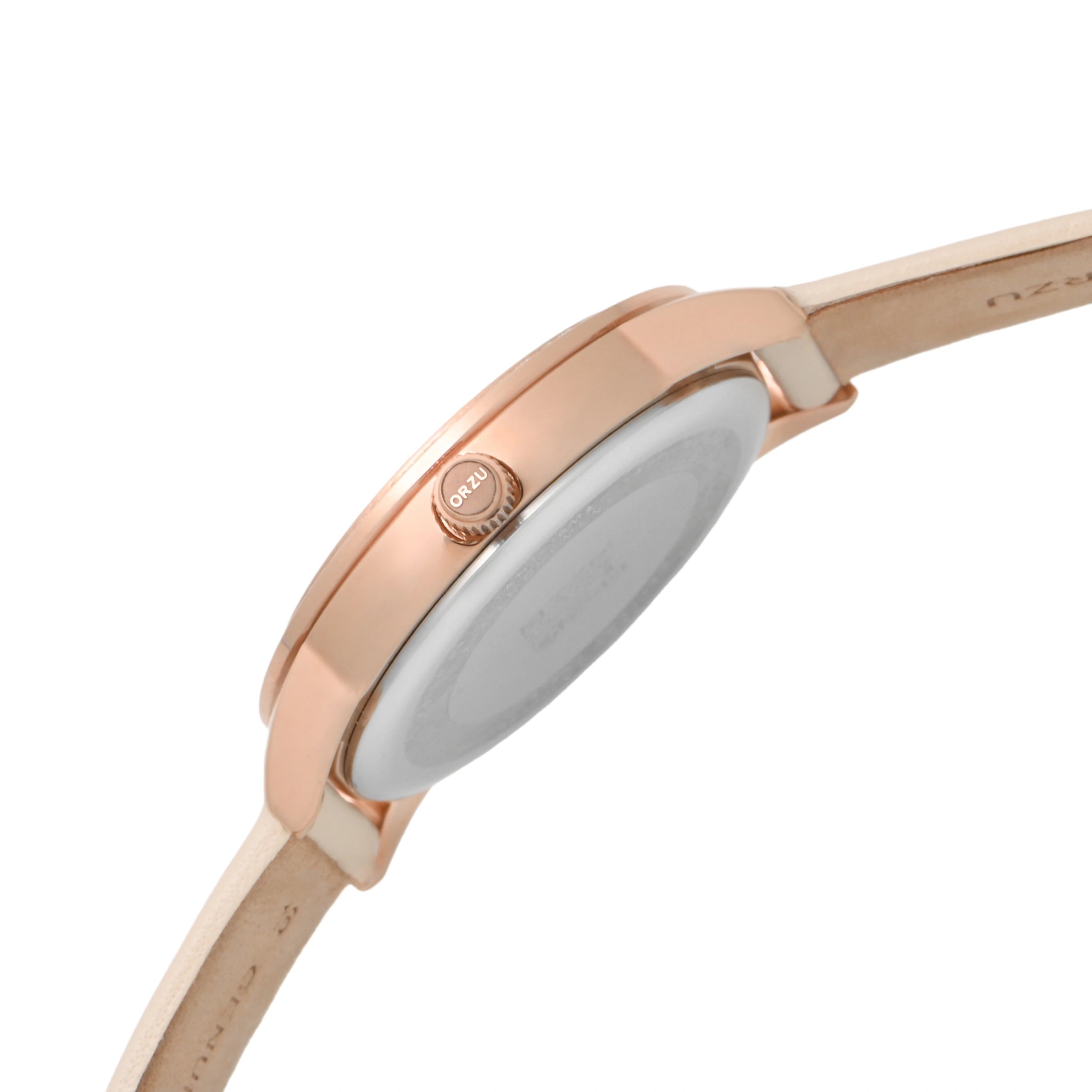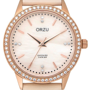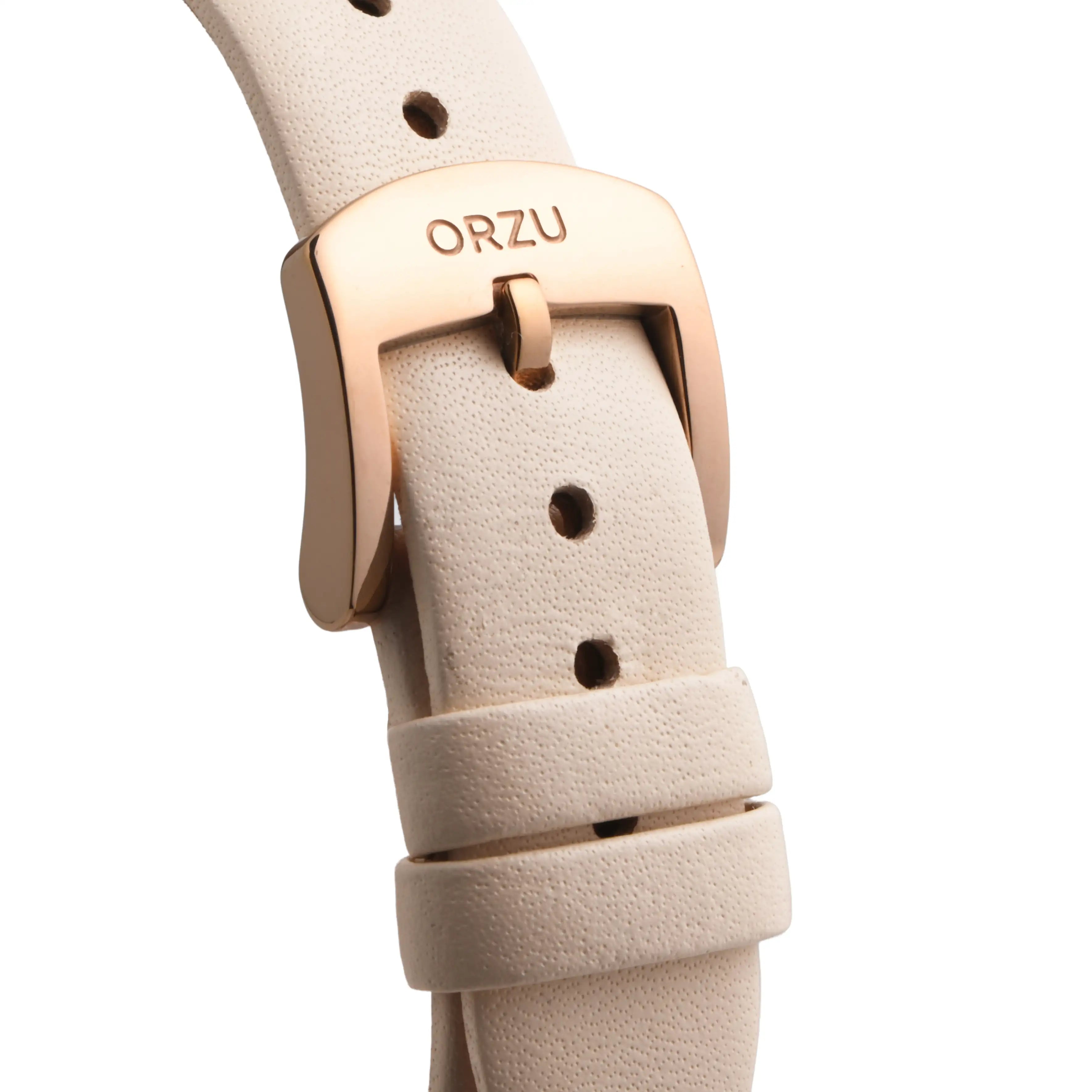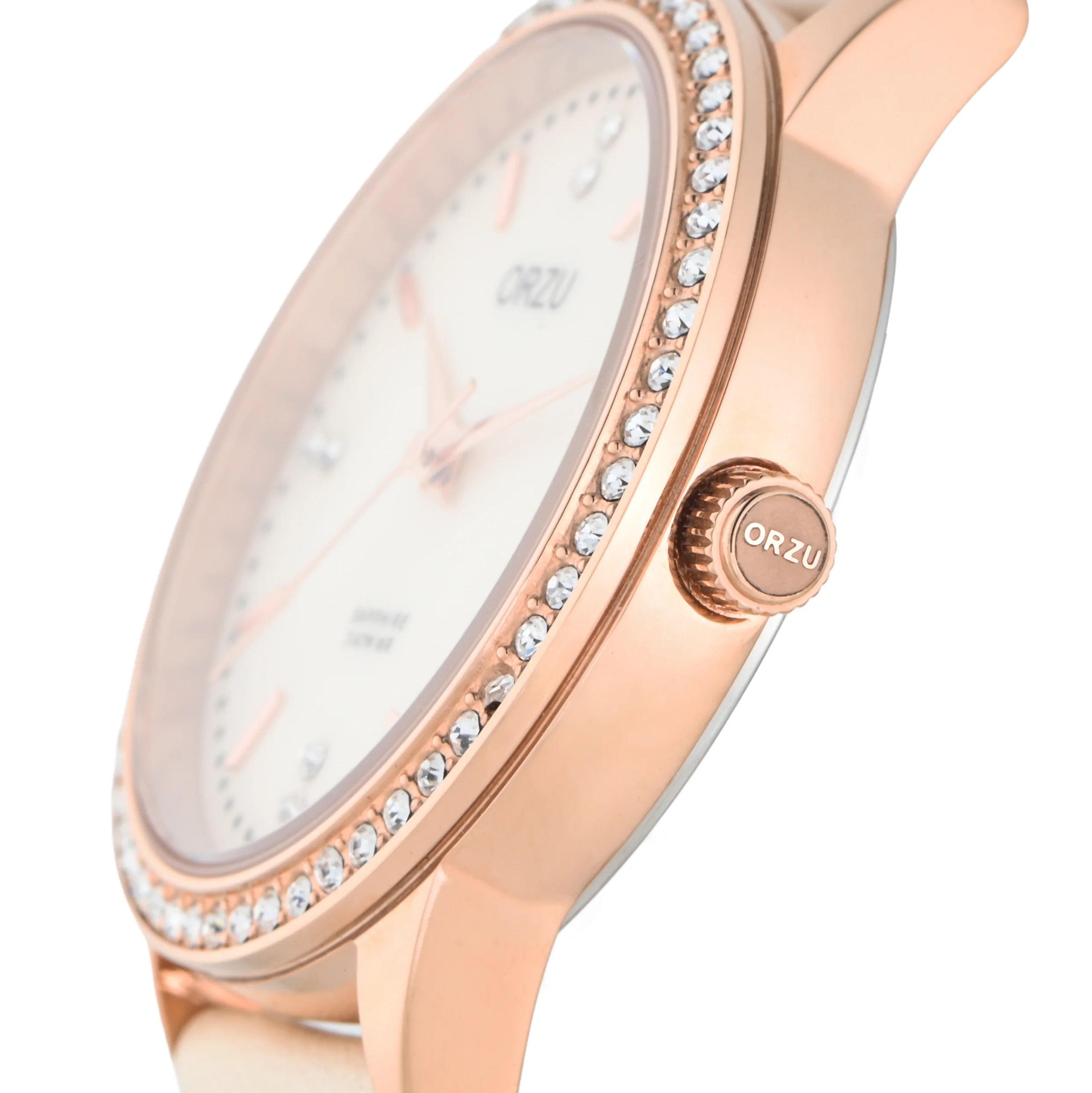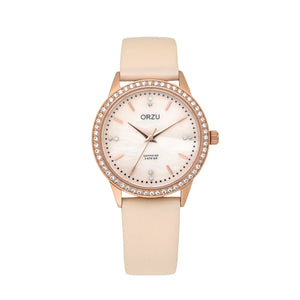 Delicate yet durable, this ORZU women’s watch features a crisp white round dial paired with a soft light pink leather strap. Designed for all-day comfort and timeless elegance, it blends premium quality with graceful charm—making it the perfect accessory to elevate both casual and formal looks.