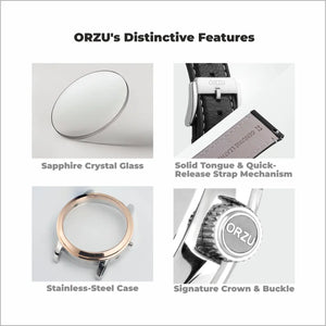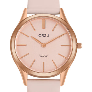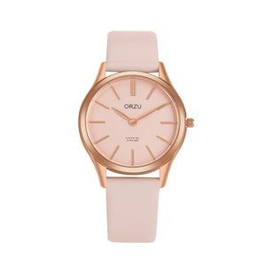 Chic and graceful, the ORZU women's watch features a soft pink leather strap paired with a clean pink round dial. Designed for lasting comfort and refined elegance, this timeless timepiece reflects ORZU’s dedication to superior quality and sophisticated design—perfect for the woman who values subtle charm and everyday luxury.