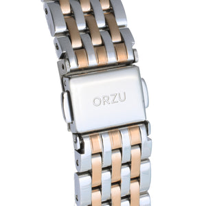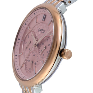 Chic and feminine, the ORZU women's watch features a silver and rose gold stainless steel bracelet paired with a soft pink round dial. Designed for lasting comfort and refined elegance, this graceful timepiece reflects ORZU’s dedication to premium quality—perfect for the woman who values modern sophistication with a delicate touch.