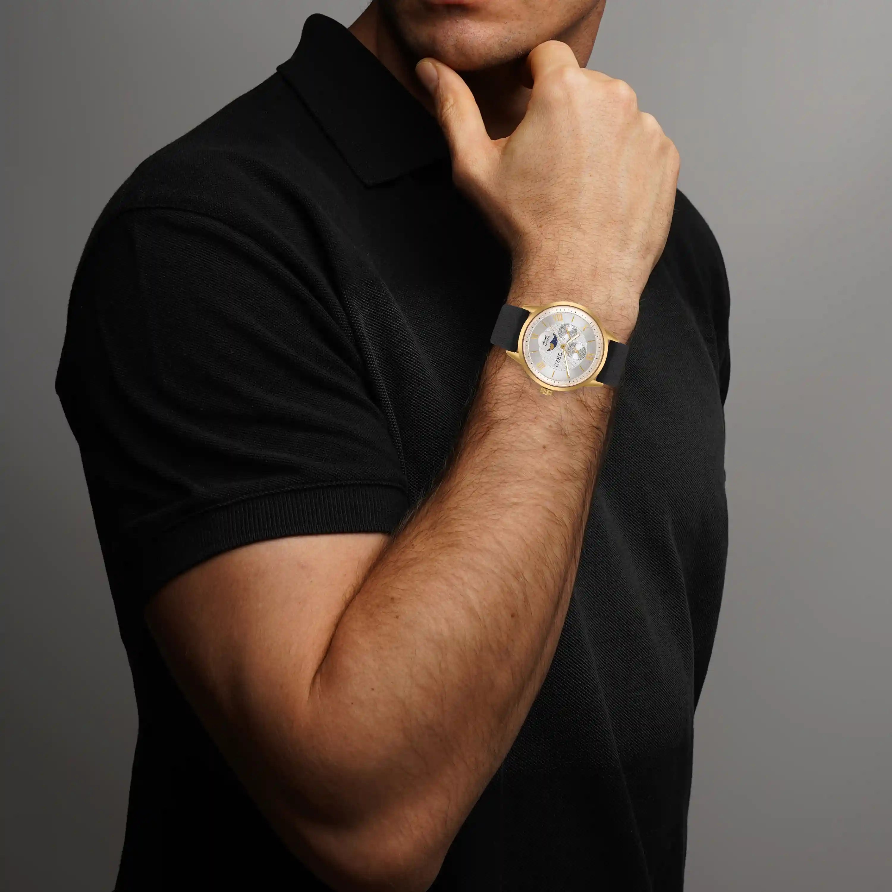 Elegant and versatile, this ORZU men’s watch features a crisp silver round dial paired with a smooth black leather strap. Crafted with premium materials for lasting comfort and exceptional quality, it offers timeless style and refined sophistication—ideal for both everyday wear and formal occasions.