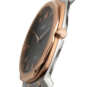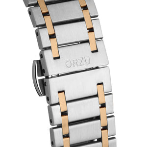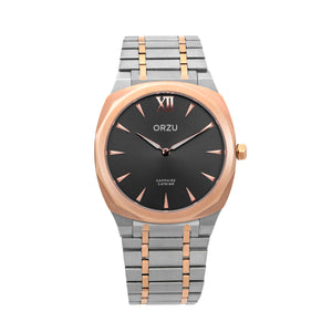 Striking and refined, this ORZU men’s watch features a bold black round dial paired with a silver and rose gold stainless steel bracelet. Crafted with premium materials for lasting comfort and exceptional quality, it offers a sophisticated blend of timeless elegance and modern style—ideal for any occasion.
