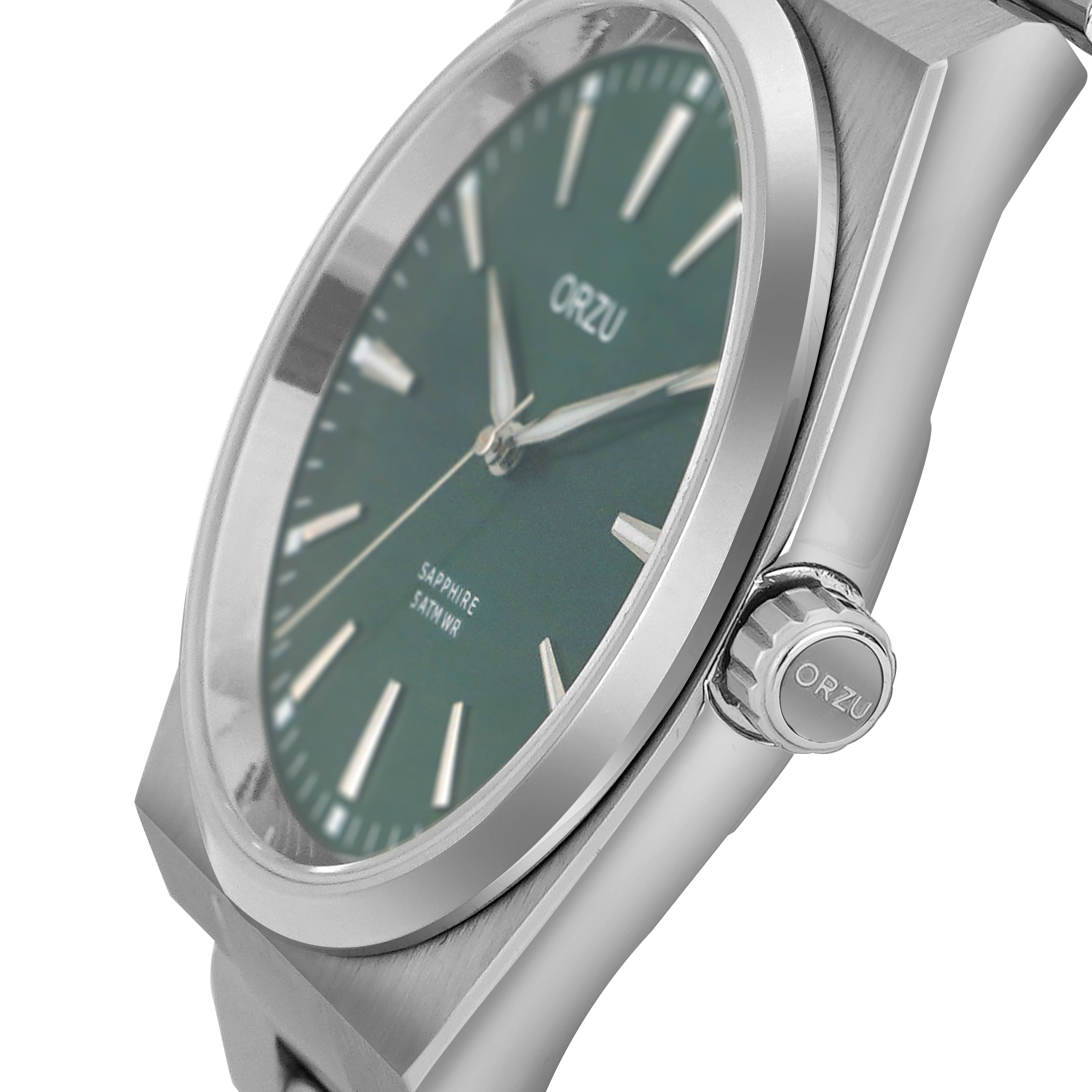 Distinctive and refined, the ORZU men's watch features a silver stainless steel bracelet and a bold green round dial. Designed for lasting comfort and elevated style, this sophisticated timepiece reflects ORZU’s dedication to premium quality and modern craftsmanship—ideal for the gentleman who values precision and presence.